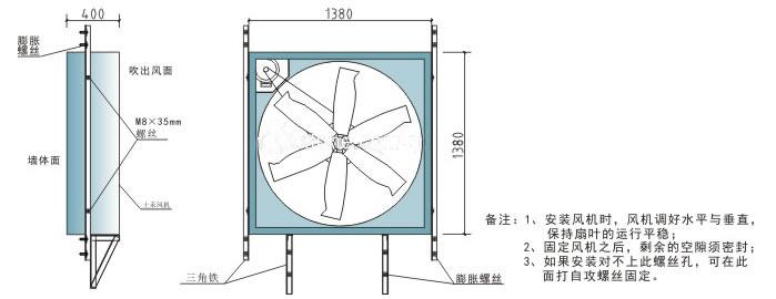 很多人对负压风机没有概念,建议您拿到负压风机实物机后,请安装的师傅到现场,让安装负压风机的师傅根据现场的情况去规划,最终决定采取怎样的安装方式,一般无外乎是用角铁吊装或者是用角铁支架安装等,原则是将负压风机安装牢固,不摇晃,不脱落,及时台来袭,也不会将负压风机吹落,最好的检验方法就是安装完毕,安装人员用力去摇晃负压风机或者人直接站到负压风机上去跳跃,只要负压风机在一般150公斤外力作用下不出现摇晃,脱落就绝对没问题。