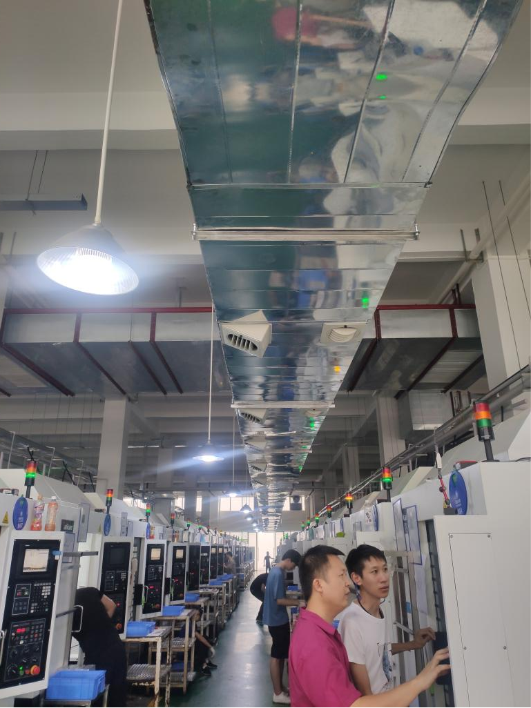 我们最终决定采用走过风管的方式解决车间降温通风的难题,让风管走到每台机,配一条管走到他们每一台CNC设备的顶端,然后在 CNC下面那个有功能操作工作的地方,开一个专用的环保空调风口,然后一直对着他们的员工吹,这样的效果非常好,首先每个冷风口对着他们员工吹,他们的员工一直吹着新鲜源源不断的清新凉风,那他们的员工就不会感觉到闷热呀,那就有效的解决了车间降温通风的问题。
