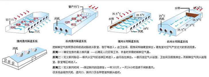 原理   湿帘降温系统的降温过程是在其核心纸垫内完成的,在波纹状的纤维表面有层薄薄的水膜,当室外干热空气被风机抽吸穿过纸内时,水膜上的水会吸收空气的热量进而蒸发成蒸气,这样经过处理后的凉爽湿润的空气就进入室内了,此时的室内即能马上达到降5-10度以上的效果。 功用   1、换气降温:由于阳光照射建筑物、机器设备、人体等热源导致需要通风的场所气温高于室外。负压风机能将室内热气迅速排出,让室温和外界温度持平,不至于车间内温度升高。